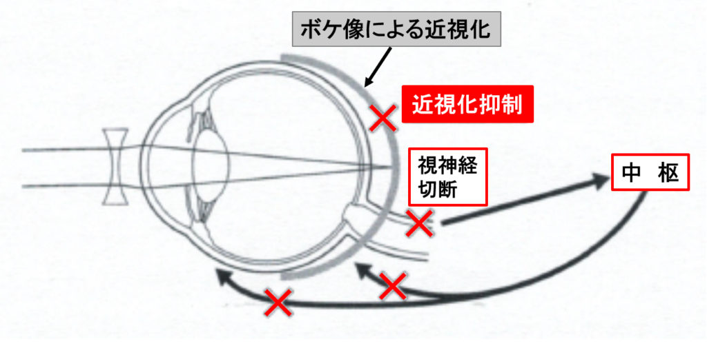 この近視化は視神経を切断することにより抑制されるため、中枢(後頭葉の視覚中枢)が関与していることが示唆されている。