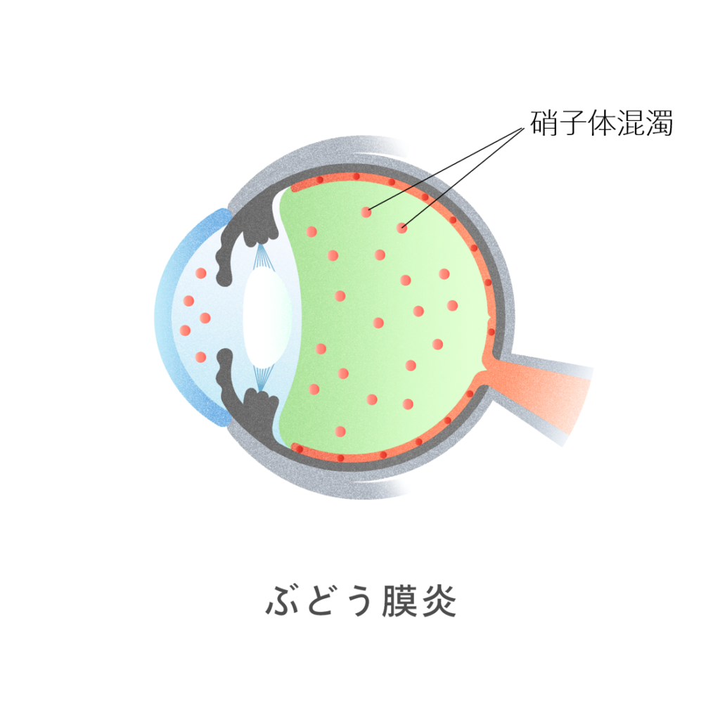 炎症によって硝子体内に細胞や蛋白成分が出現し、硝子体混濁を生じた状態です。煙がかかったように見える飛蚊症や、視力低下を伴うことがあります。